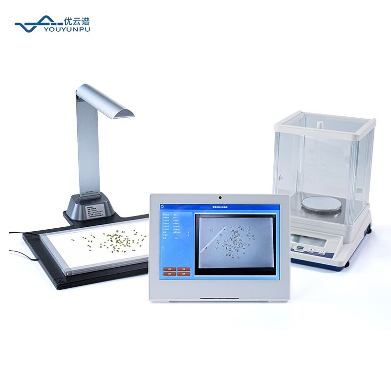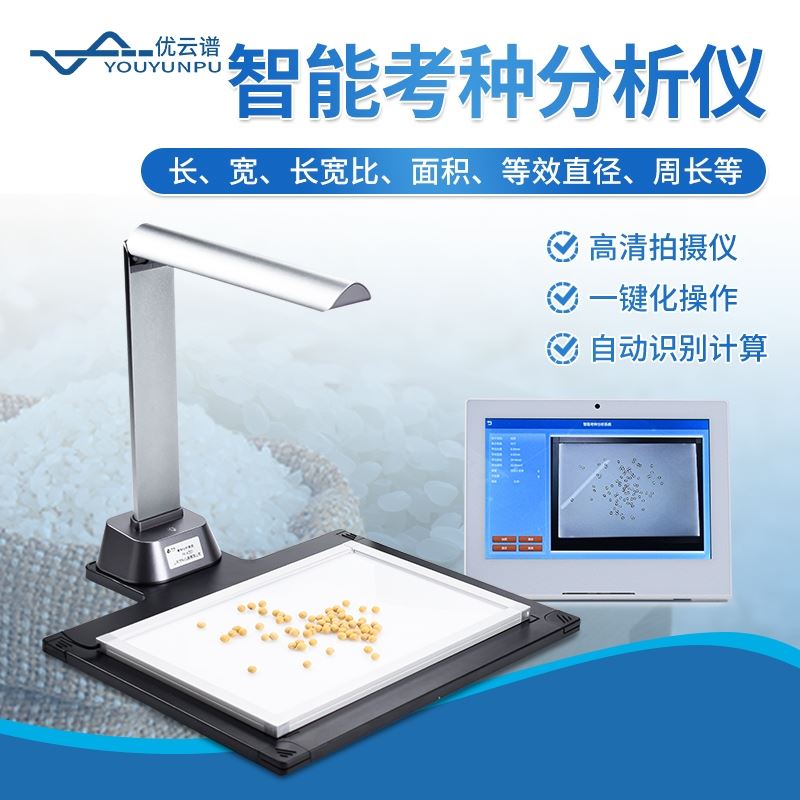 智能考种分析仪由三部分组成:1600万高拍仪、背光装置和装有嵌入式软件的平板。背光装置采用的是高亮LED灯,外边框使用铝合金材质制成。软件采用良好的图像处理技术,根据距离变换原理、形态学、凸包检测等技术综合设计的一款嵌入式软件。该设备主要应用在农业领域的田间作物测产及考种等方面,通过高拍仪拍摄的照片,软件自动计算种子数量,种子的面积、周长、长度、宽度、长宽比等数据,根据天平所得的重量与种子的数量自动计算出千粒重;以列表和图形的方式输出结果,便于用户查看与分析研究。本产品也可以手动对作物种子数量修正以确保计数精度、对数据进行保存,并且可以查看数据报表,最后可以将数据以Excel格式导出,或者通过WiFi数据上传到仪器云数据管理系统从而实现数据统计,分析智能化。
